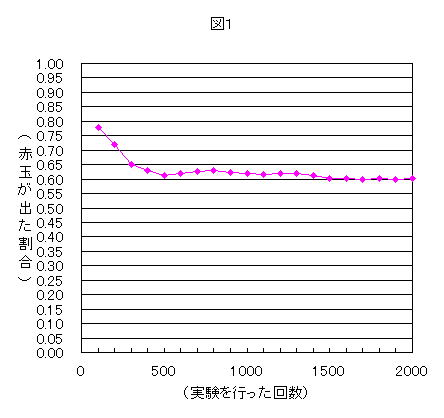 図1は、この実験を行った回数に対する、赤玉が出た割合を、グラフに表したものである。