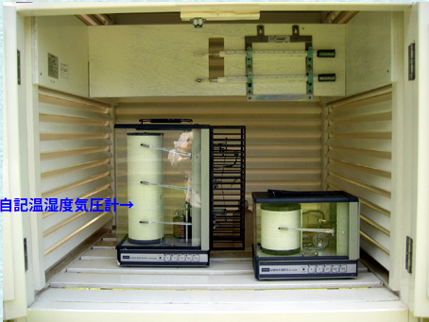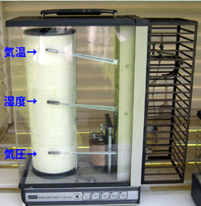 自記温湿度気圧計は、気温、湿度、気圧の変化を、それぞれ同時に連続記録する装置です。このような自動化された観測装置があると気温や湿度・気圧の連続した変化を、くわしく調べることができます。
