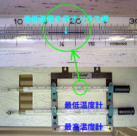 最高最低温度計は、1日の最低気温と最高気温を示す温度計です。1日に1回、記録したとき(午前9時など)に、管の中のガラス棒や水銀を元に戻しておきます。
