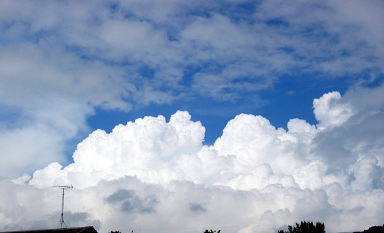 天気が晴れかくもりかは、空をおおっている雲の割合(雲量)で決まります。雲量は雲がないときを0、空一面雲でおおわれているときを10と表します。雲量0~1は快晴、2~8は晴れ、9~10がくもりです。雲は、その形や現れる高さによって、10種類に分けられています。それぞれの雲は天気の変化と深い関係があり、雲を観察することで、天気の変化をある程度予想することができます。