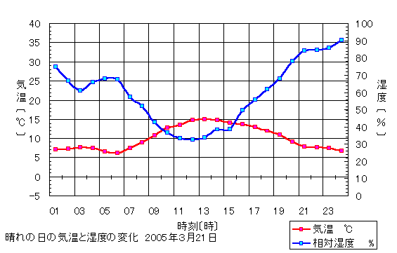 わかったこと 1 晴れた日は、気温・湿度ともに大きく変化する。 2 気温は明け方(6時)ごろに最も低くなり、正午すぎ(13~14時)ごろに最も高くなる。 3 湿度は、夜間高くなり、日中は気温とほぼ逆の変化をし、正午すぎごろに最も低くなる。