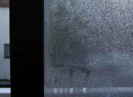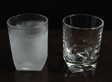 左の写真は、冬の朝、窓ガラスについている水滴です。右の写真は、夏に、冷凍庫から出した冷たいコップ(左)と部屋の気温と同じ温度のコップ(右)をならべて置いたときのようすです。左の冷たいコップのまわりは「しも(氷)」がついて白くくもっています。これは、窓ガラスや冷たいコップの周囲の空気が冷やされたために空気中の水蒸気も冷やされ、目に見える水滴や氷に変わったためです。水蒸気が冷やされて水滴に変わることを凝結といいます。では、空気中の水蒸気からどのようにして水滴や氷が生じるのか調べてみよう。