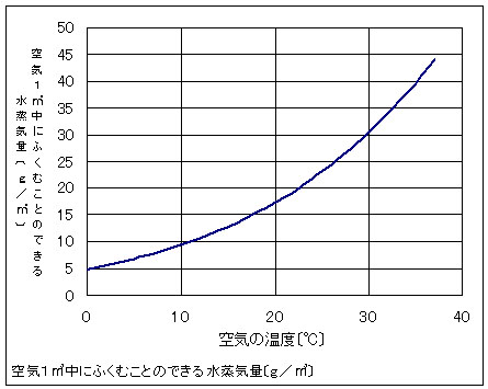 図は、空気1立方メートル中にふくむことのできる水蒸気量と空気の温度との関係を示したものです。いま、30℃の空気が17.3gの水蒸気をふくむとき、湿度は56.9%です。この空気の温度が下がっていくと、20℃で飽和に達するので、露点は20℃です。このとき湿度は100%です。さらに温度が10℃まで下がると、ふくみきれない水蒸気17.3-9.4=7.9gが水滴になります。マウスカーソルをグラフに置いてみよう。