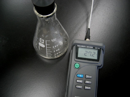 ピストンを引くと、フラスコ内の空気は膨張して温度が27.4℃から27.2℃へ下がりました(右図)。また、フラスコ内が白くくもることから、水蒸気が凝結することがわかります。(左の写真にマウスカーソルを置くとピストンを引く前のようすを表示する。)