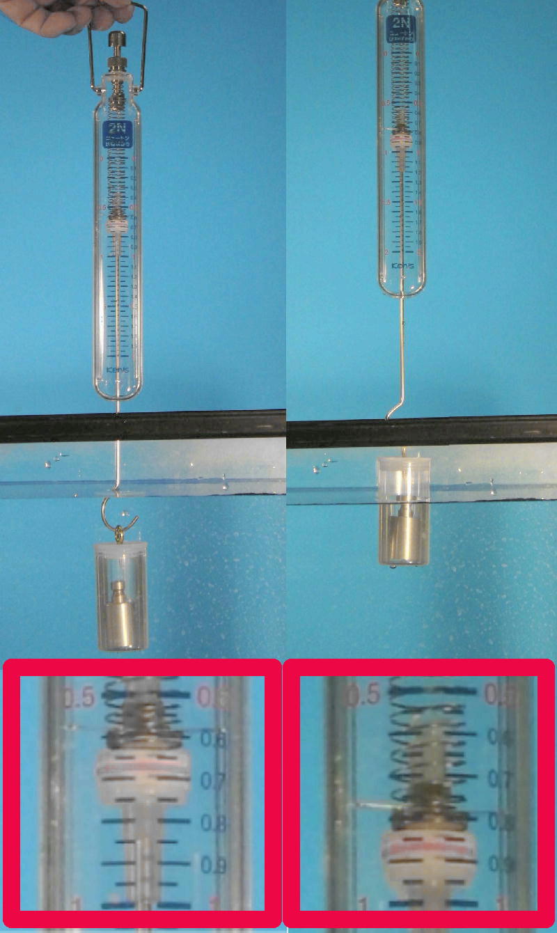 左のように、おもりをすべて水に入れたときと、少しだけ水に入れたときでは、支える力が違います。