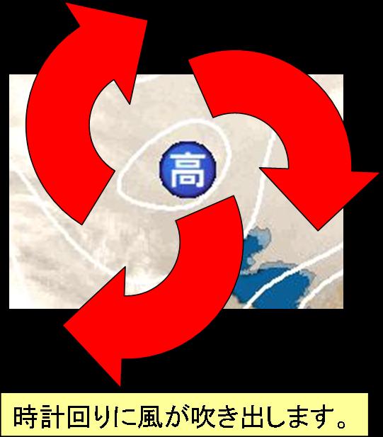 高気圧の回りでは、時計回りに風が吹き出しています。