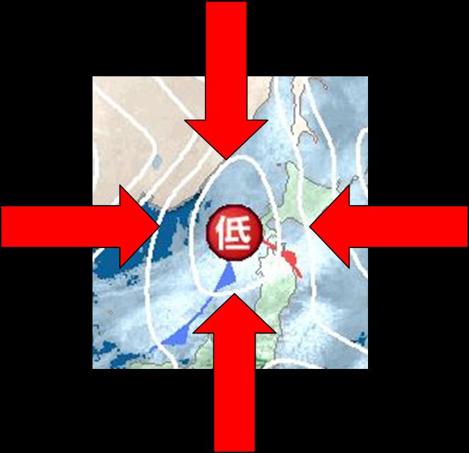周囲より気圧が低いため、地上付近では、矢印のように周囲から中心に向かって空気が移動します。