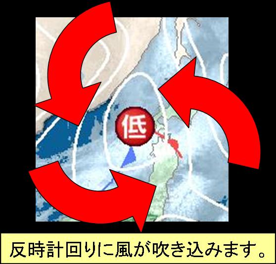 低気圧の回りでは、反時計回りに風が吹き込んでいます。