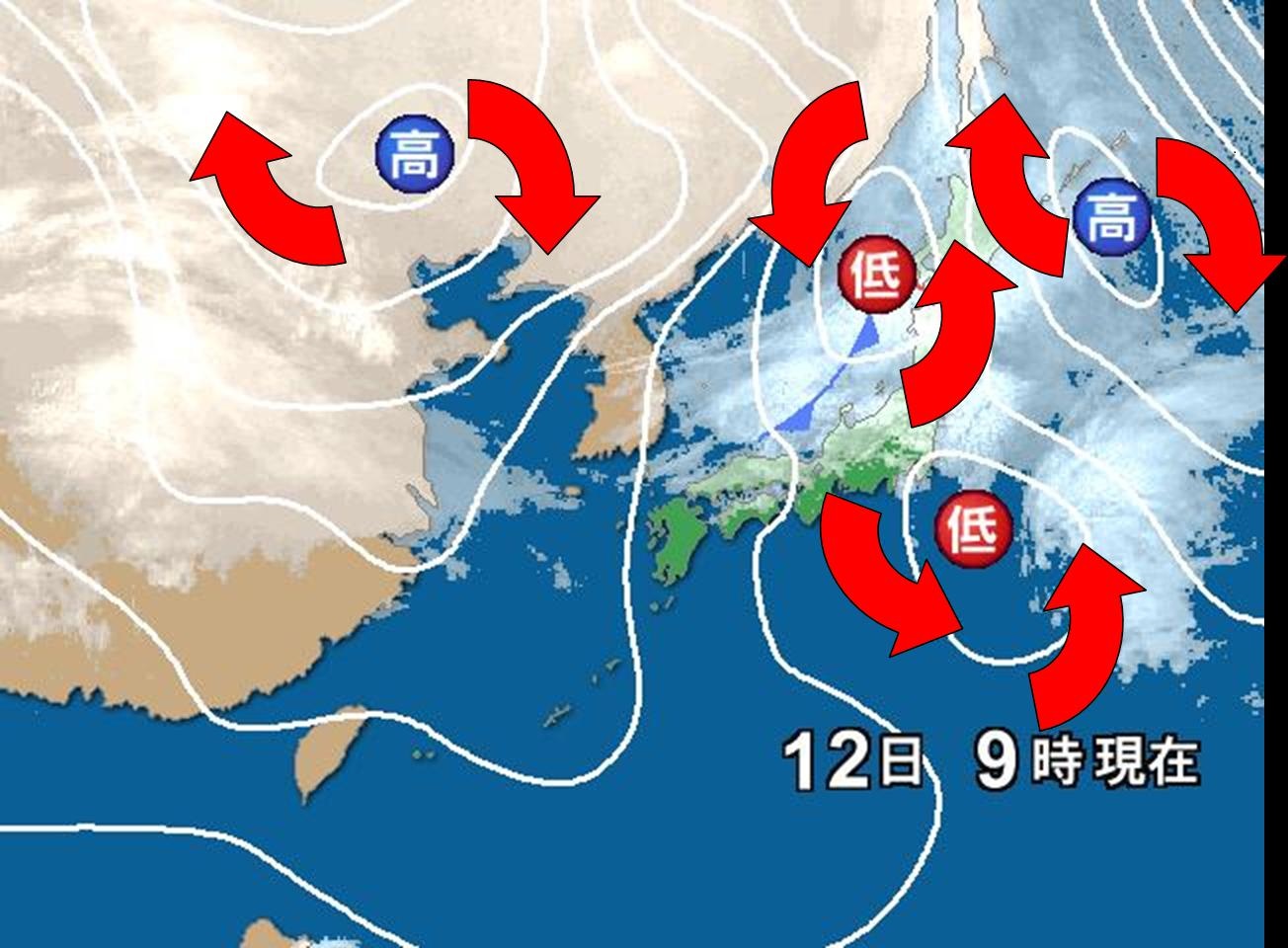 (北半球において)高気圧付近では、時計回りに風が吹き出し、低気圧付近では、反時計回りに吹き込んでいます。
