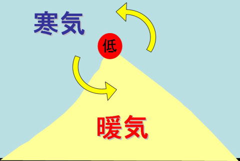 日本付近(中緯度地域)の低気圧は、反時計回りに風が吹き込みます。 そのため、低気圧には、普通、温暖前線と寒冷前線がともないます。 (図にカーソルをあわせる)北から寒気、南から暖気を吸い込むため図のような前線で表します。