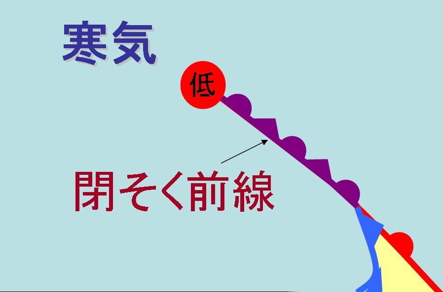 このように寒冷前線が、温暖前線に追いついてできる前線を閉そく前線といいます。