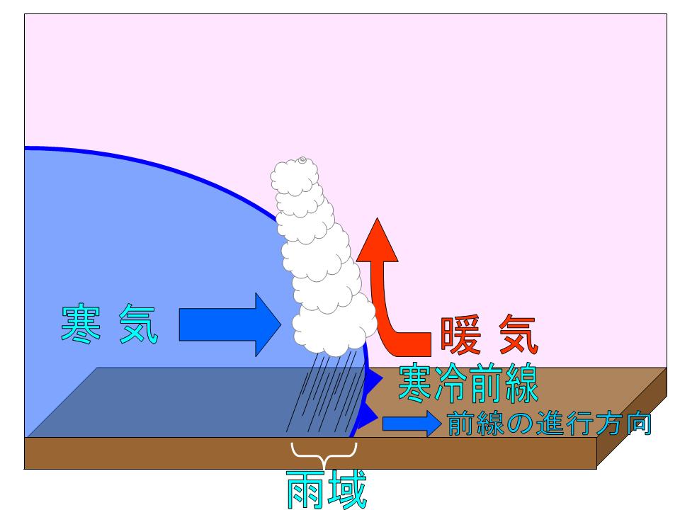 このように寒冷前線付近では、寒気が暖気の下にもぐりこみ、上昇気流を発生させています。
