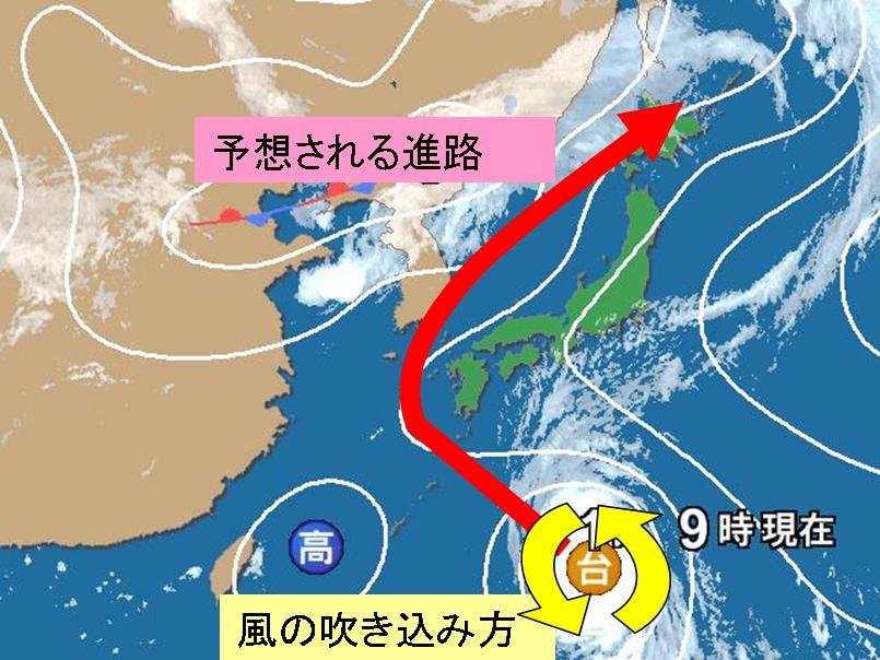 夏になると、日本のはるか南の暖かい海上で発生した熱帯低気圧のうち、最大風速が17.2m/s以上に発達したものを台風といいます。 台風は、最初は北西に向かって進むが、日本付近では偏西風の影響を受け、東寄りに進路を変えます。 また、高気圧の縁を通って進むことも多いため、図のような進路が予想できます。 低気圧と同じく北半球では、反時計回りに風が吹き込みます。 (天気図は2007年8月1日のものです。台風5号)