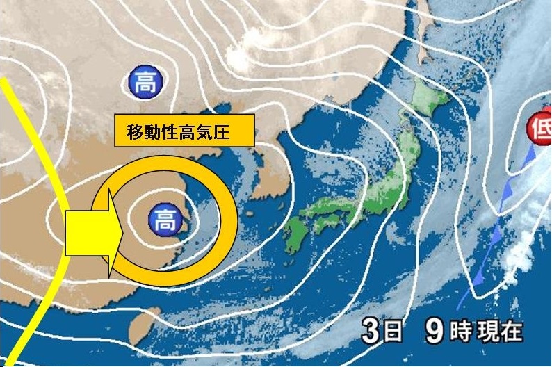 春や秋になると、西側から高気圧が移動してくる。