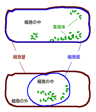 ・通常の状態の細胞(図の上)では細胞膜は膨れて細胞壁と密着しているので、細胞膜と細胞壁を区別して観察することは難しいです。