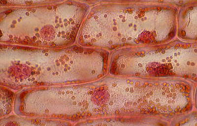 葉緑体のように色のあるものは観察しやすいのですが、染色をしないと核は観察することが困難です。そこで核の観察には、酢酸カーミンや酢酸オルセインなどの染色液を使うことがあります。