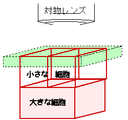 顕微鏡のピントが合う範囲が一定であることをよく理解していると、ずらしながら観察し、見ているものの立体像を想像することができるようになります。オオカナダモは大きさの違う2層の細胞で葉が作られています。観察しやすいので、実際にピントをずらしながら観察してみましょう。
