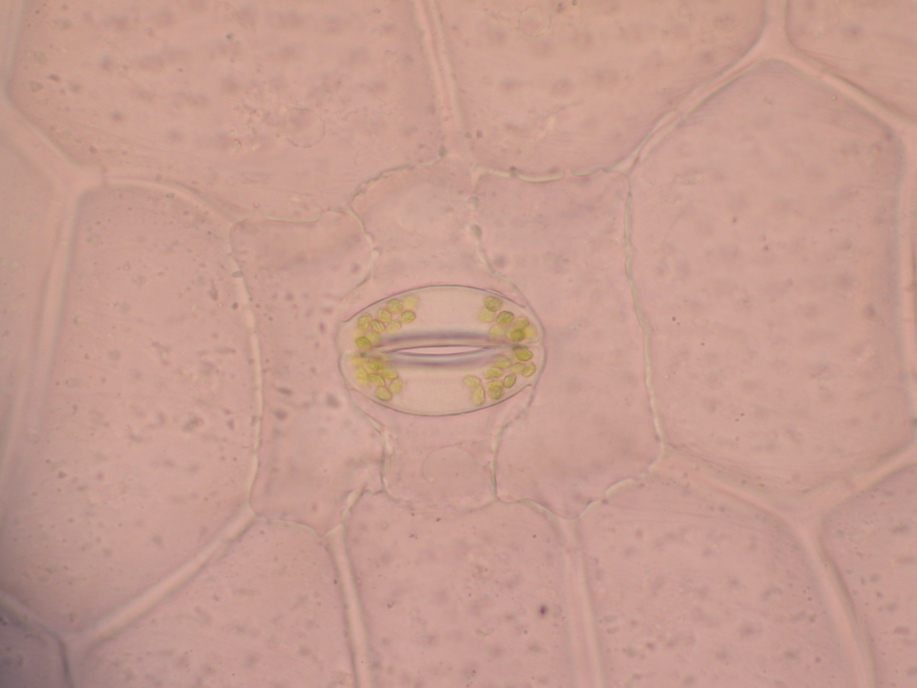 葉の裏側の表皮を観察すると、たくさんの細胞でできていることがわかります。また、光合成や蒸散で大切な役割をしていた気孔もたくさん観察できます。ピントをずらしたりしながら観察すると、「気孔の周りにある三日月型のところには葉緑体があるが、他の細胞では葉緑体が観察できない。」ということがわかります。