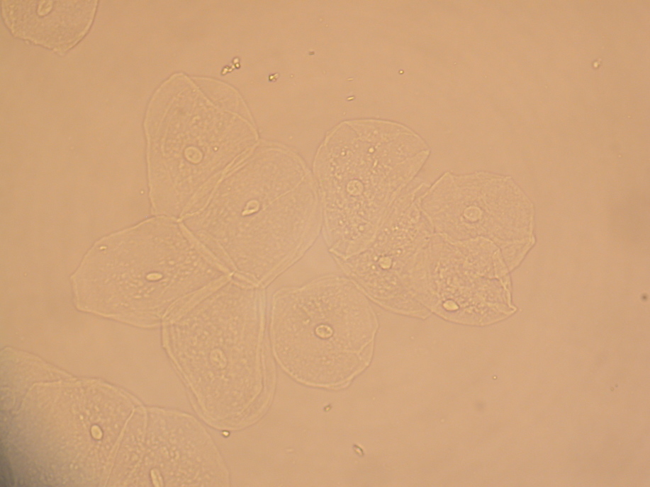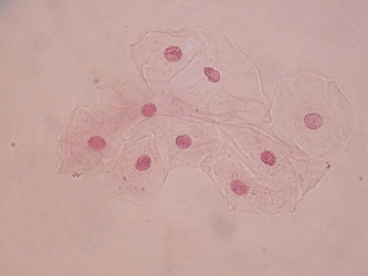 ヒトほおの内側の細胞にも、1つの細胞に1つの核がありました。核以外にはっきりとした構造は見つかりませんが、細胞質に小さな粒子があることがわかります。