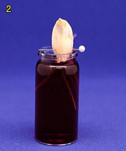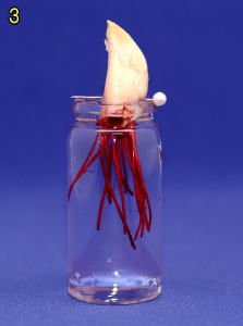 これで根の染色が終わりました。ニンニクの根は水耕栽培ができるので、根を水に浸して成長の様子を観察します。ただし、根は暗い所でよく成長するので、全体を黒い容器で覆い、光の入らない条件で根を成長させます。
