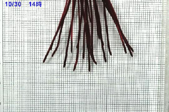 長さの変化がわかるように背景に方眼紙を置いてみました。10/30 14時から、11/1 9時までの4枚の画像です。