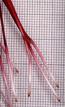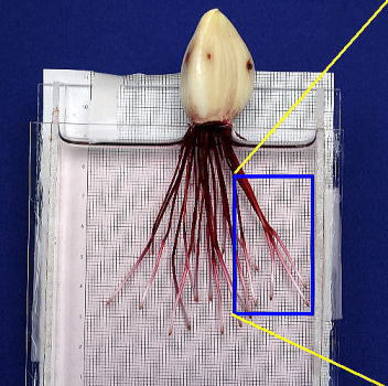 実験の結果を見ると、根元に近いところは色の変化がなく、根の先端の色が薄くなっていることがわかります。(根の先端1mmのところは赤い色が残っている)