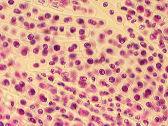 核を染色したニンニクの根を軽く押しつぶして観察してみました。