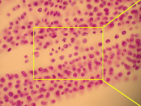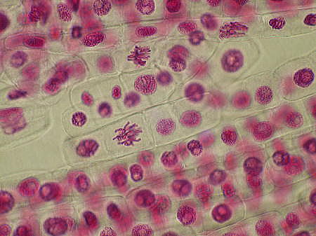 軽く押しつぶした先端をさらに観察してみると、本来は球形である核がひも状になっているところを発見しました。これは