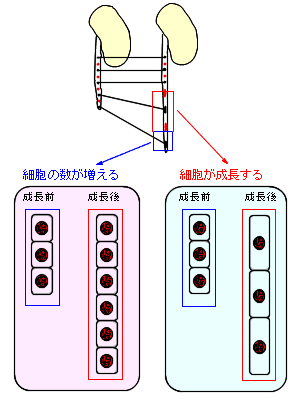 ・細胞分裂しているところのやや上の部分では、細胞自体が大きくなることで根が成長する。