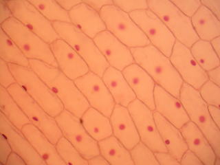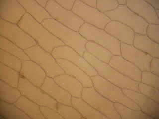 細胞分裂では核がどのように変化していくかを観察します。染色をしないと左写真のように核の様子はよくわかりません。そこで、右写真のように核を
