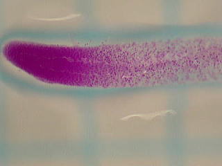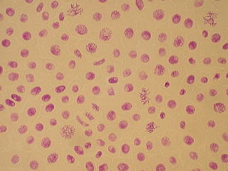 根の先端は、たくさんの細胞が立体的に積み重なってできています。細胞分裂は×400以上の高倍率観察が必要になるため、右の写真のように細胞を重ならないよう一層に、かつできるだけ平坦にして観察します。そのためには、根の先端を細胞の大きさに合わせて薄く切るか、細胞をバラバラにすることが必要です。薄く切る方法は難しいので、細胞をバラバラにする方法で行います。