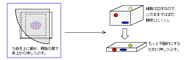 体重をかけてもカバーガラスは割れません。真上からしっかりと押しつぶします。