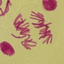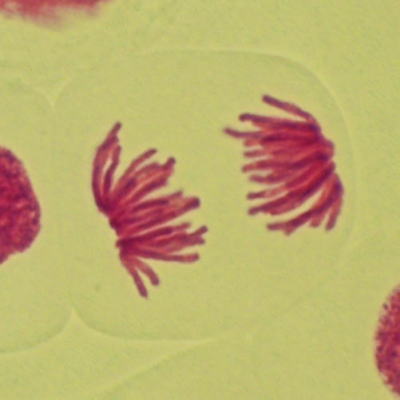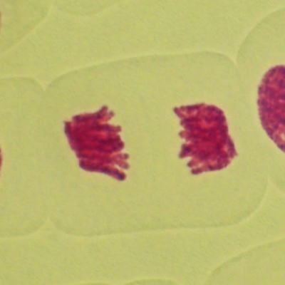 ・両端に移動した染色体がしだいに見えなくなり、2個の核が現れる。