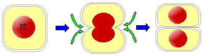 細胞の分裂は、下の図のようにあんパンを真ん中からちぎるように2つの細胞に分かれる方法の方が簡単そうです。ところが、ほとんどの生物は細胞分裂の時に染色体が現れます。