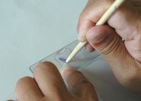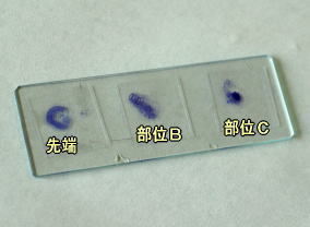 細胞をバラバラにし、上からしっかりと押しつぶします。写真からはわかりにくいですが、先端はすぐにバラバラになるのに対し、部位Bや部位Cではなかなか細胞がバラバラになりません。これは、先端から部位B、部位Cになるにつれて細胞壁が発達し、細胞が解離しにくくなっていることが考えられます。
