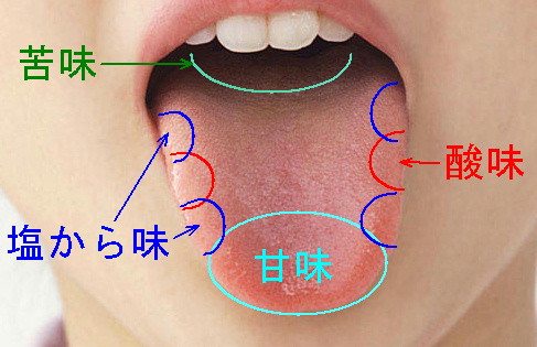 また、舌は場所によって感じることができる味覚が異なります。その分布は左図の通りです。