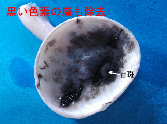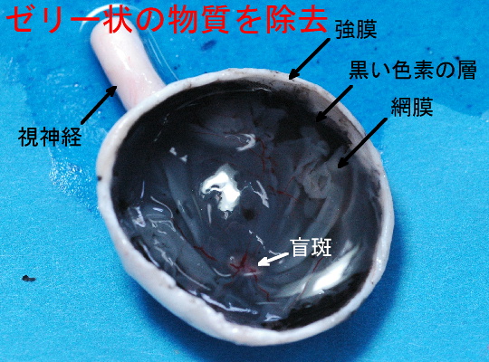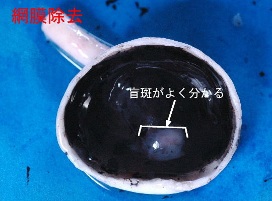 ・黒い色素の層の内側には白っぽい膜があり、今にもはがれそうでした。この膜が網膜です。網膜には血管が広がっています。