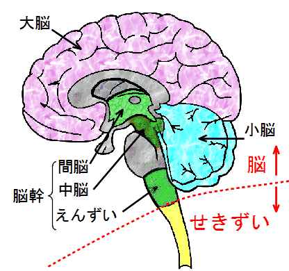 ヒトの脳は、大きく大脳、小脳、脳幹(脳の中心に縦につながっている部分)の3つに分けられます。脳幹はさらに、間脳、中脳、えんずいの3つに分けられます。