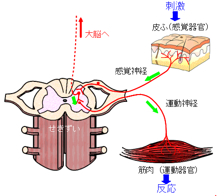 ・信号はせきずいを通って大脳へも伝わりますが、 熱いと感じるよりも先に反応が起きます。