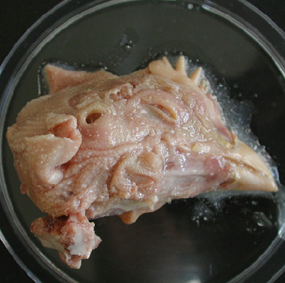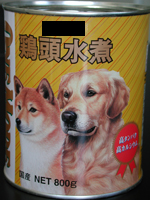 缶詰1つに、右写真のようなニワトリの頭が15個くらい入っています。においも堅さもツナの缶詰に似ています。指で押すと崩れてしまうくらい軟らかくなっています。