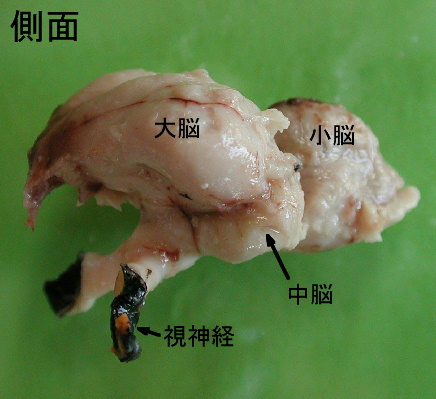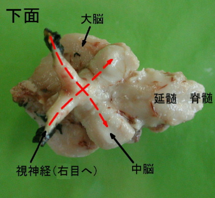 ・視神経がはっきり分かります。左右が交差していて、右目からの情報は左脳へ、左目からの情報は右脳へ入ります。