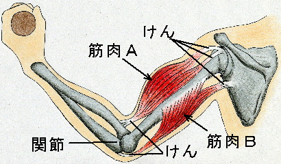 このように、関節の両側の骨には、ふつう一対の筋肉がついており、一方が収縮することによって関節が曲がります。もう一方の筋肉が収縮することによって関節が開きます。