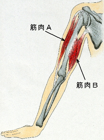 図1 筋肉Aが収縮→ひじの関節が曲がる→うでが曲がるこのとき、筋肉Bはゆるむ