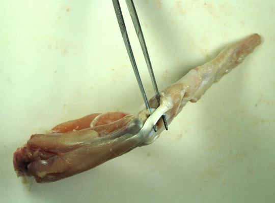 ・まず、左写真のように腱をピンセットで持ち上げながら、筋肉とのつながりを観察します。