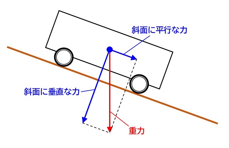 斜面の上の台車には重力がはたらいています。