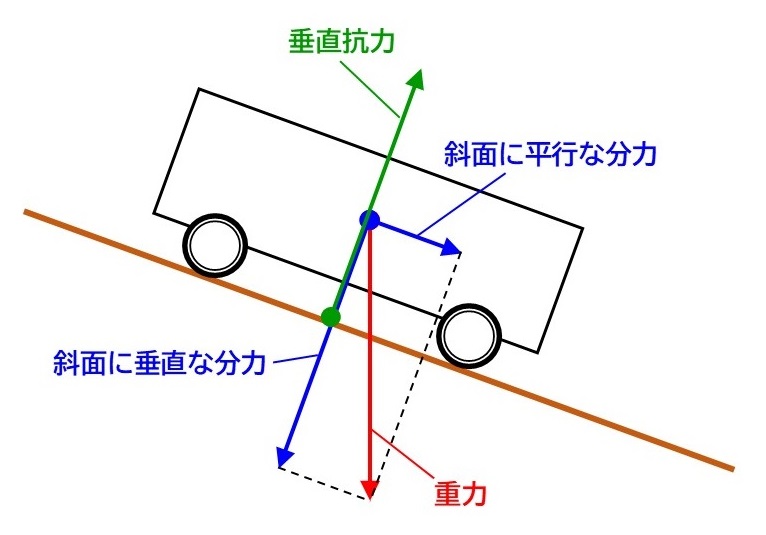 斜面に平行な力だけが残るので、台車は斜面方向に進みます。