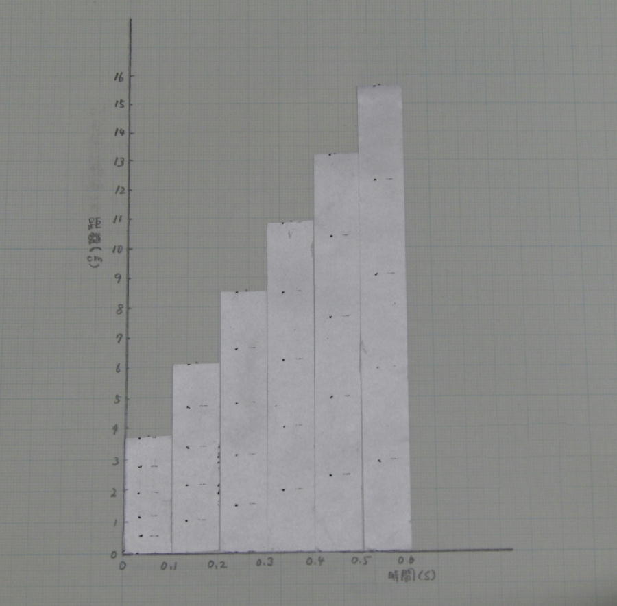 斜面を下る台車の運動を記録した記録テープを5打点間隔に切って方眼紙にはり付けてみると左のようになりました。