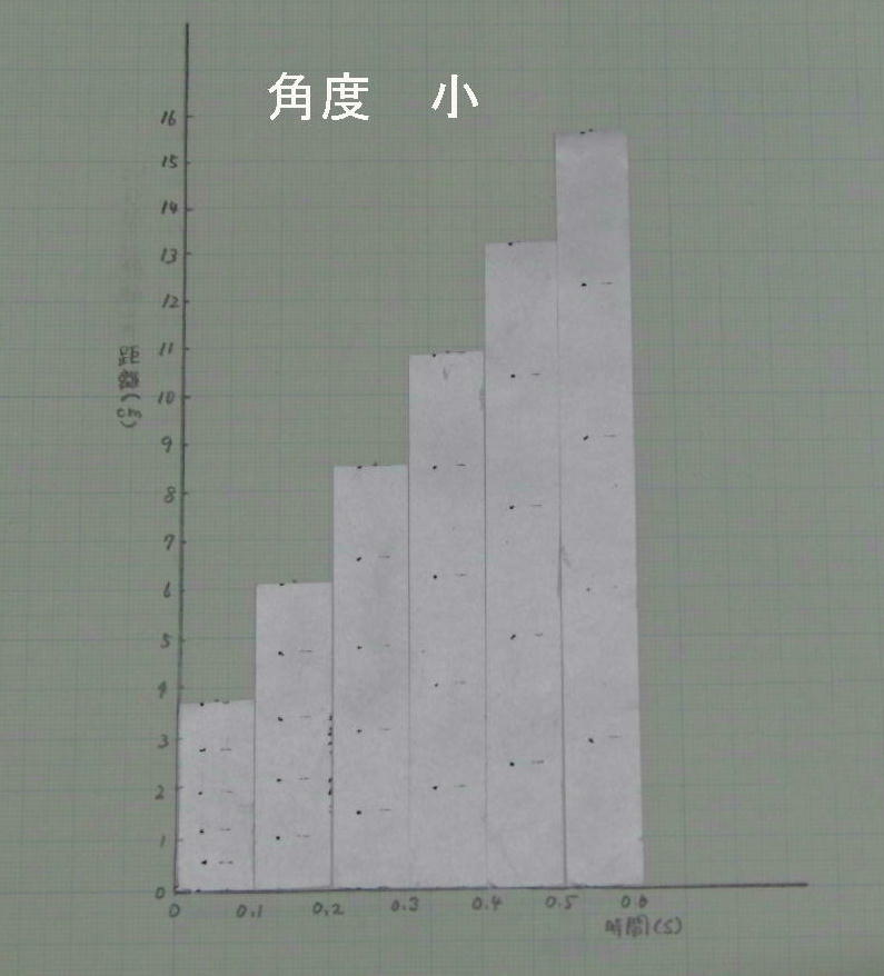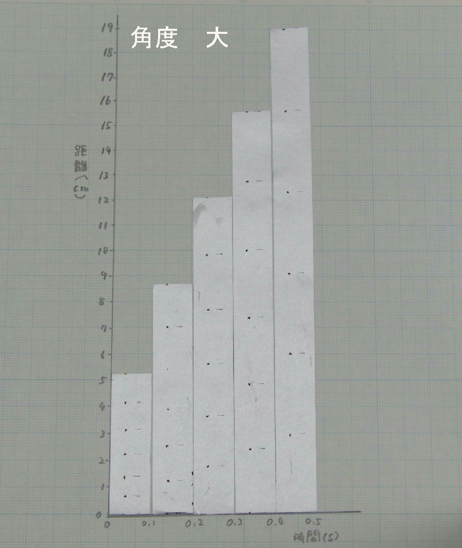 角度を変える前の記録テープの図と比べて速さは大きく変化していることがわかります。
