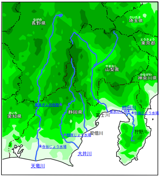 川の水が、どのようにしてみんなのところへとどくのか、天竜川、大井川、柿田川の旅に行こう!
