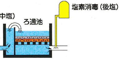 でろ過して、小さなゴミを取りのぞき、きれいな水にするんだよ。 その後に、最後の塩素消毒をして、